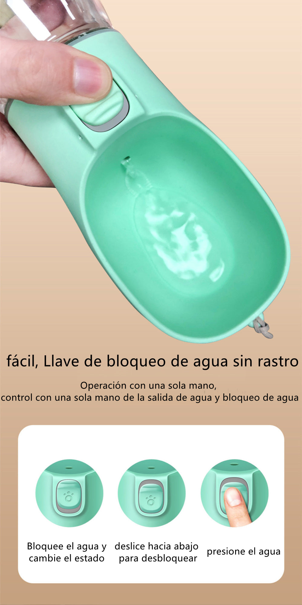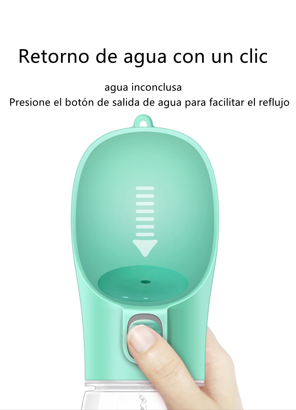 - Sin Derrames, Sin Problemas: Diseñada con una tecnología a prueba de fugas, esta botella te permite llevar agua fresca para tu mascota sin preocuparte por los derrames en tu mochila o bolso.